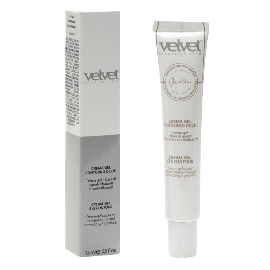 La crema-gel contorno occhi Velvet contrasta le piccole rughe, attenua le occhiaie e le borse sotto gli occhi. È in grado di preservare la riserva idrica dell’epidermide conferendo turgore alla delicata zona perioculare. A base di attivi emollienti, restituivi e stimolanti.